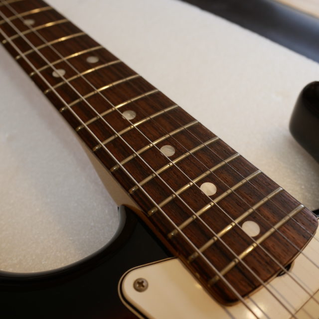 1弦側の5フレットの指板サイドにぶつけたような欠けがあります。
