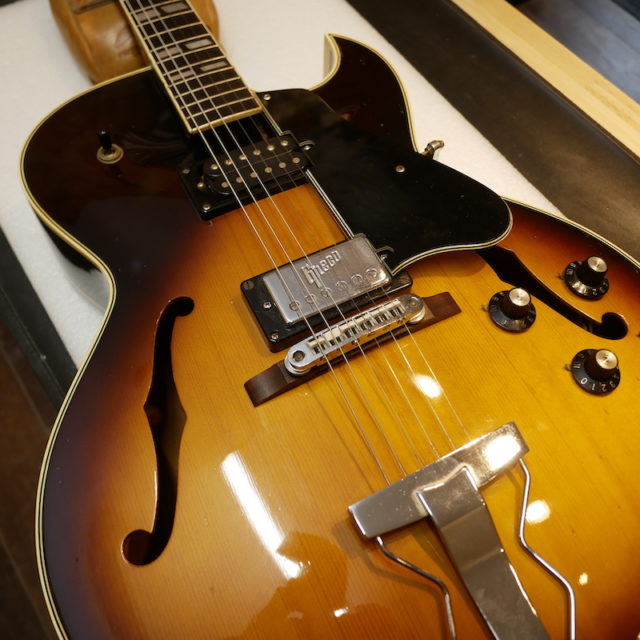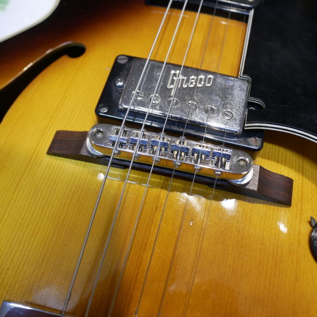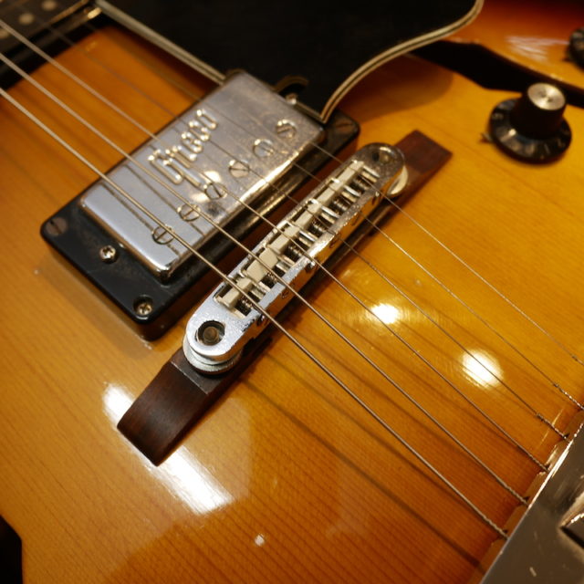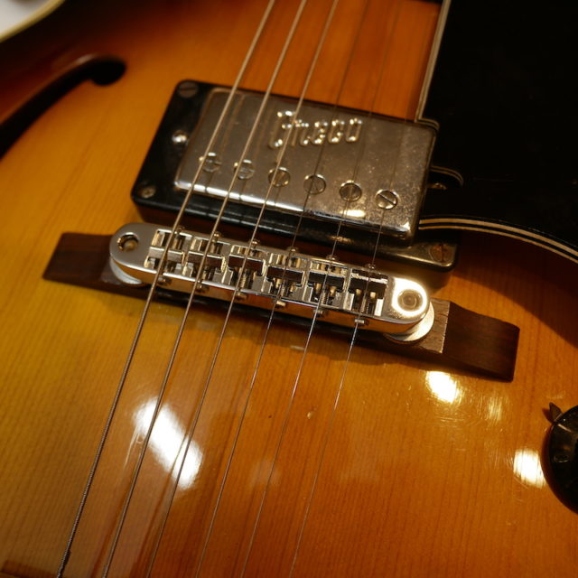 フルアコはブリッジがボディの上に乗っかっているだけのため、弦を外すと動いてしまいます。