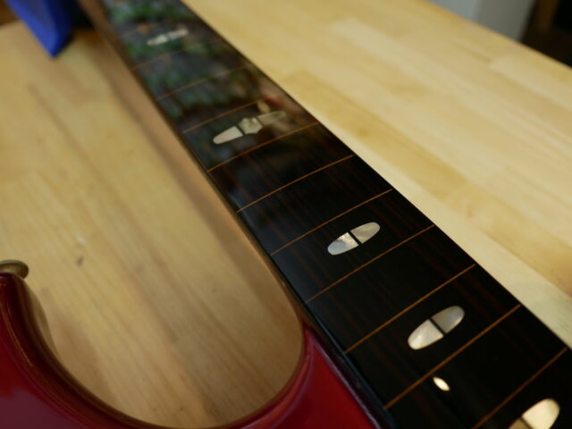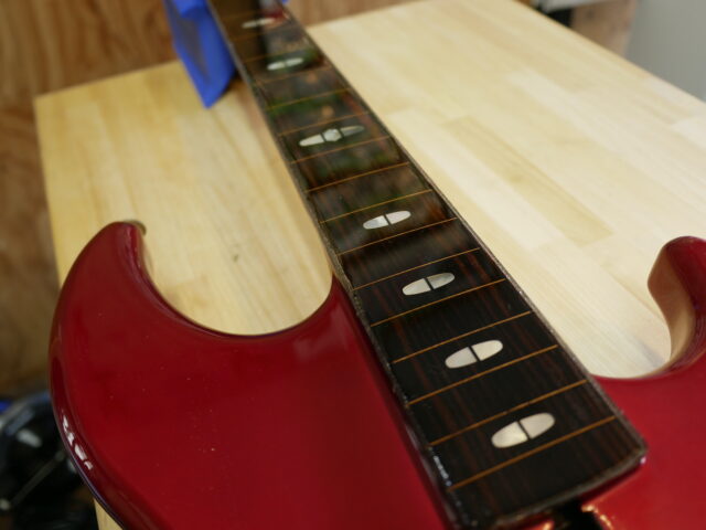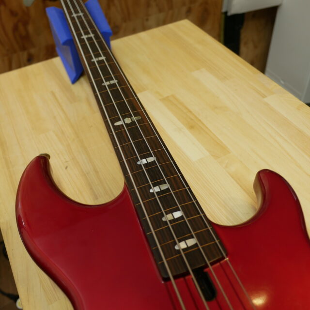 今回のリペアはフレットレスベースの指板のエポキシコーティング。