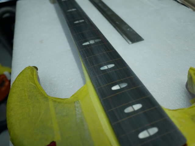 しっかり硬化を待って、指板にRをつけるように削ります。