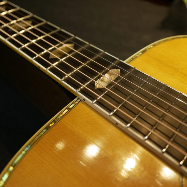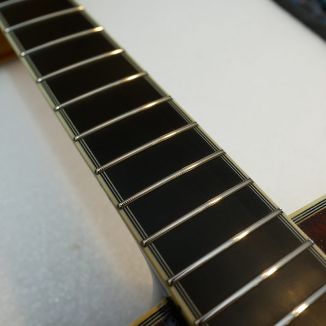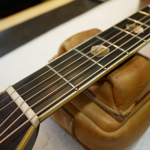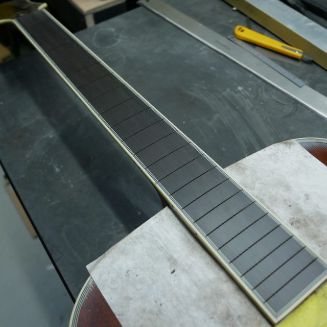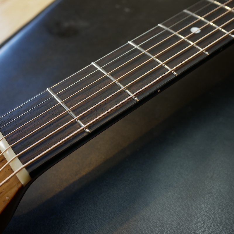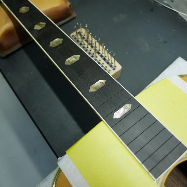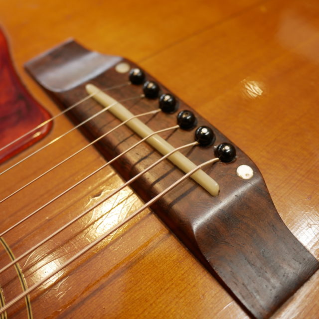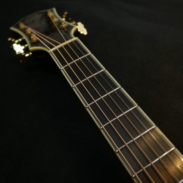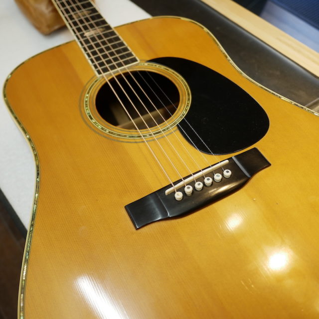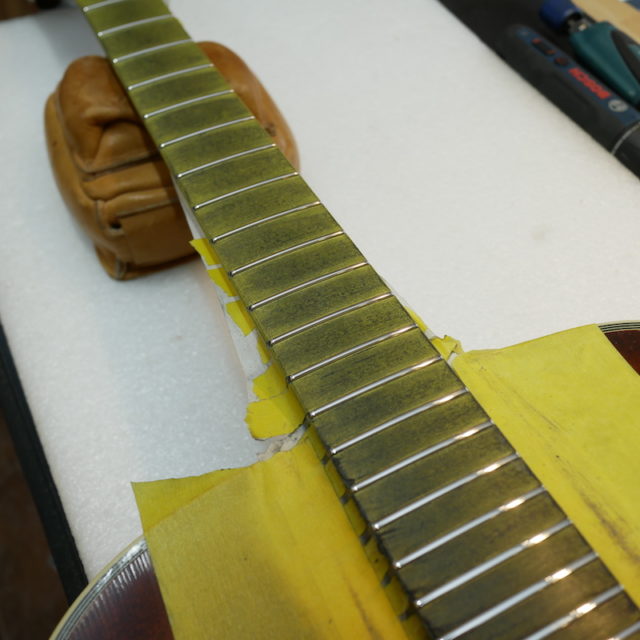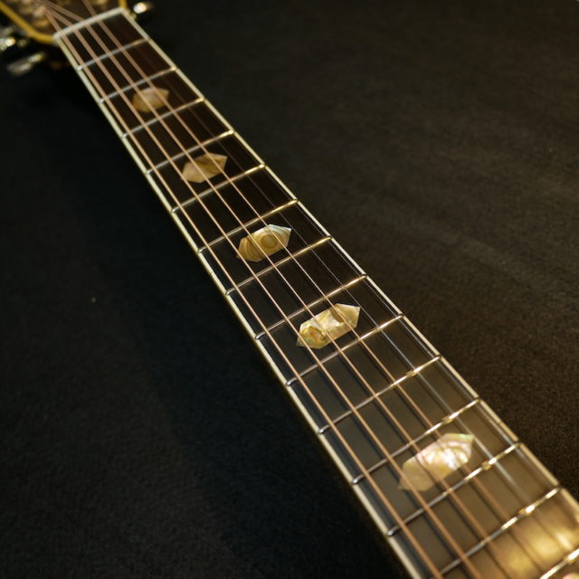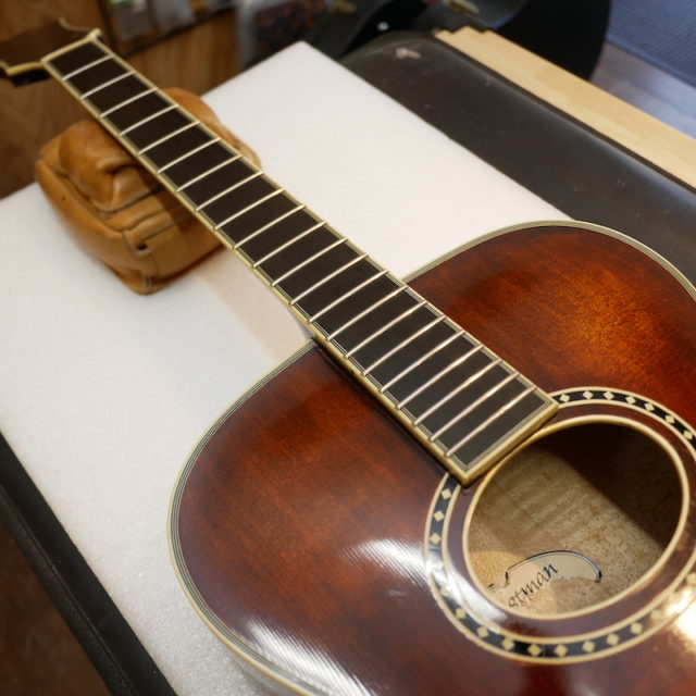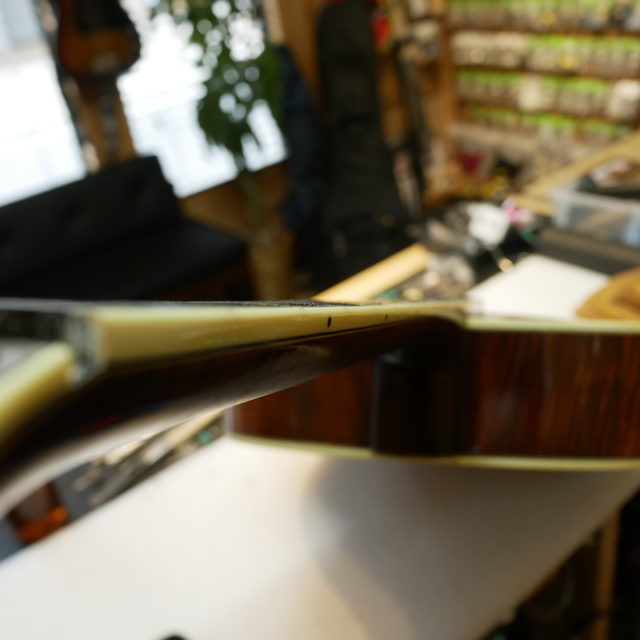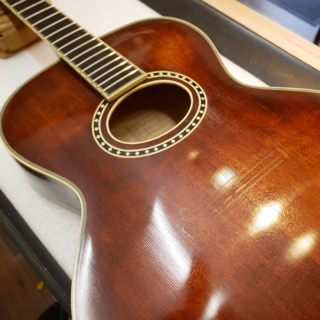 元々ついていたピックガードは、反って剥がれてしまったそうで、今貼ってるものも別で製作したもです。