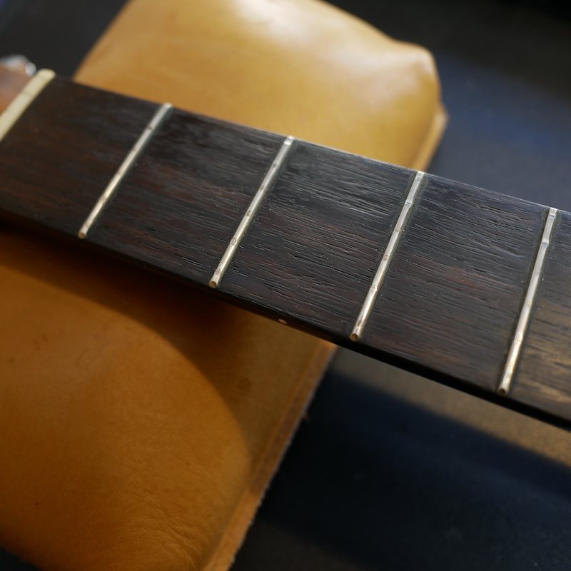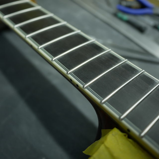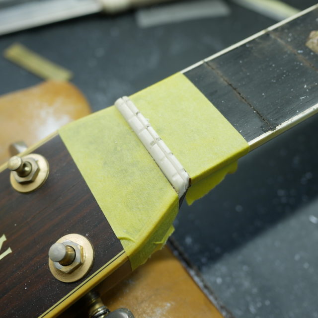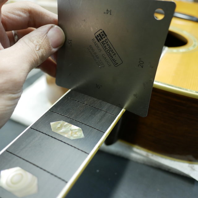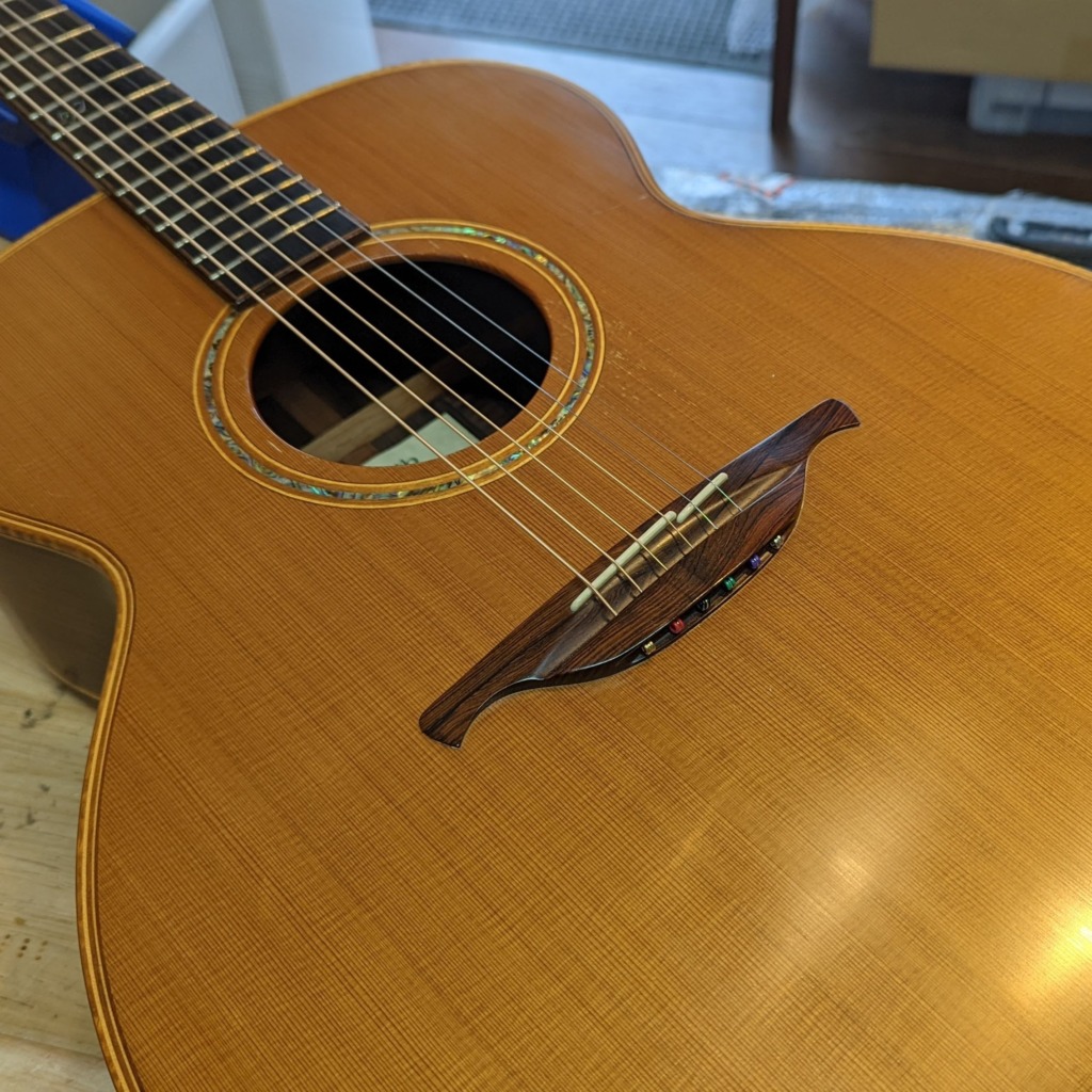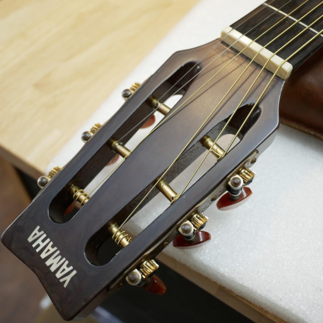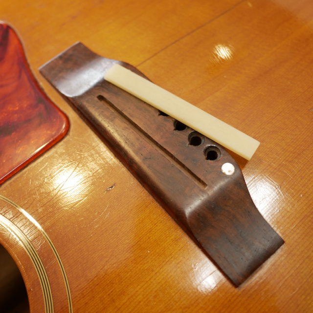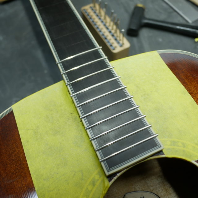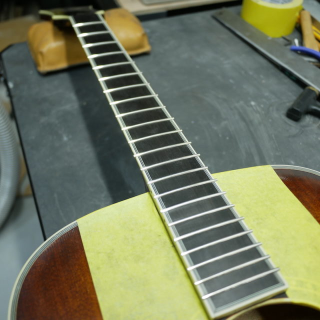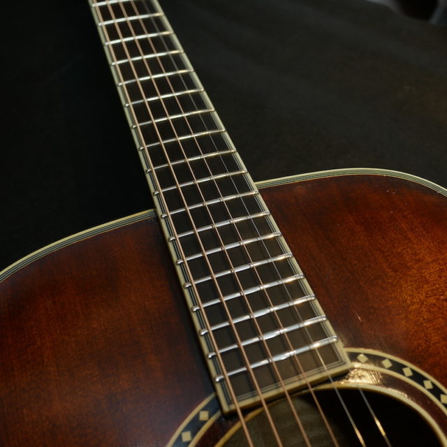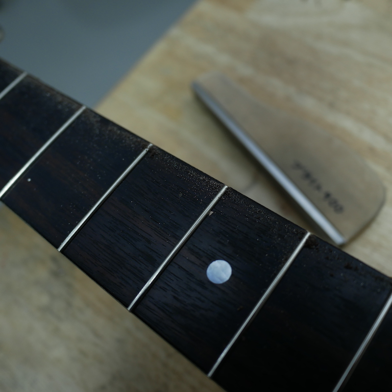 元々ついていたピックガードは、反って剥がれてしまったそうで、今貼ってるものも別で製作したもです。