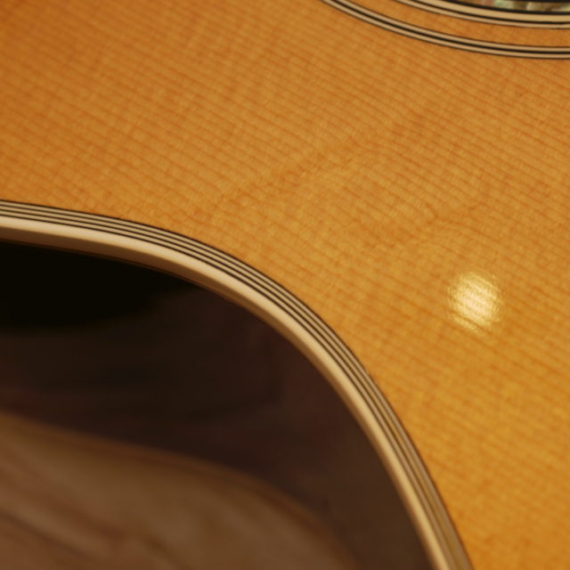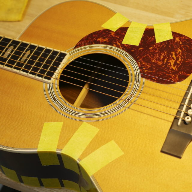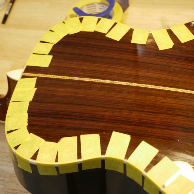 ブリッジとボディをしっかりと接着するために、ボディトップの塗装を剥がします。また、ボディも反っているので面も確保してあげます。塗装分、落とし込みの様になります。