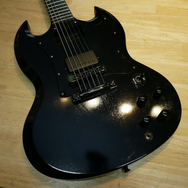 ポジションマークのないエボニー指板、ブラック一色のギター。更にリアピックアップ一発。