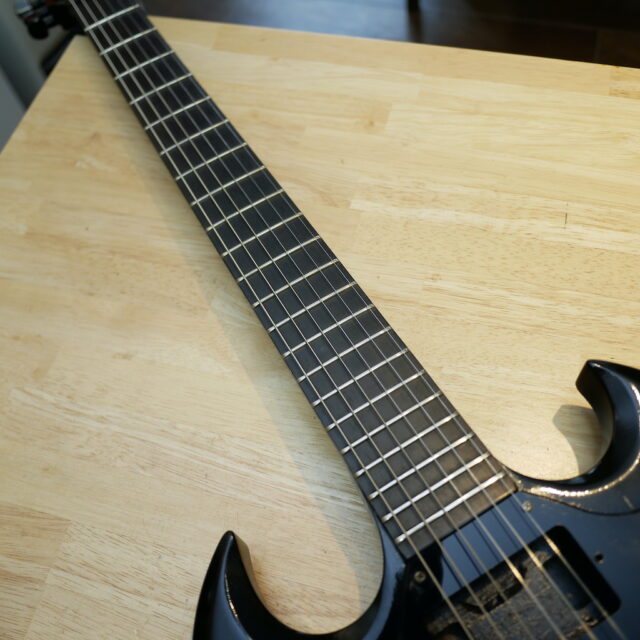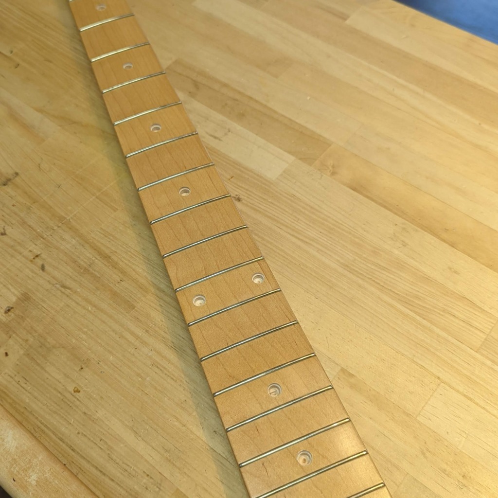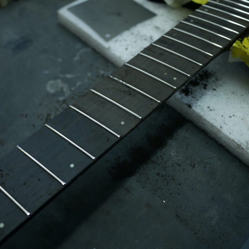 まず、この指板にディッシュインレイを入れて、フレットもフリーダムスレンレスフレットに交換です。