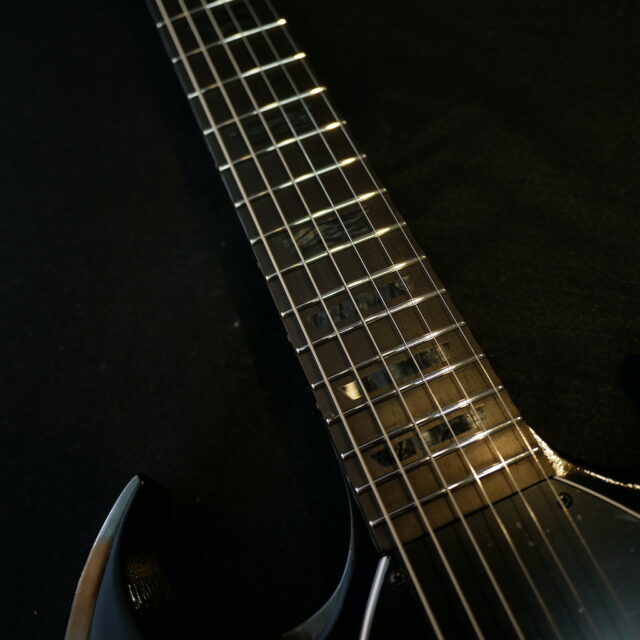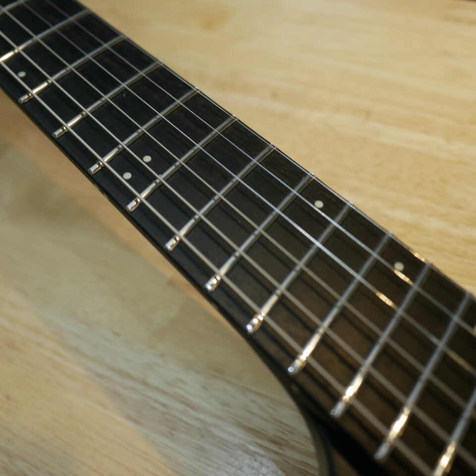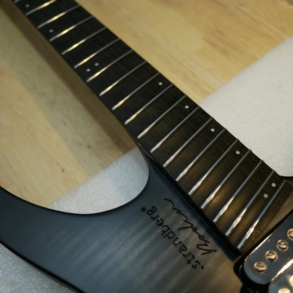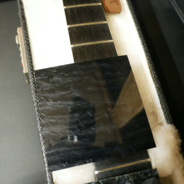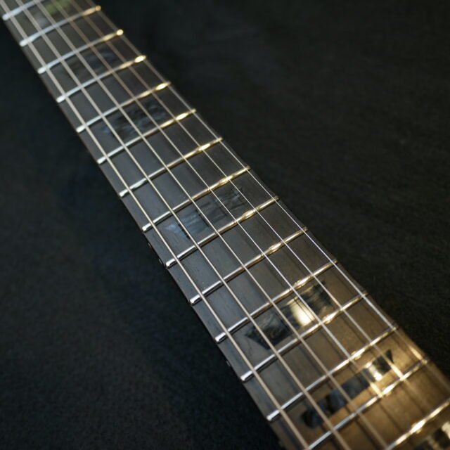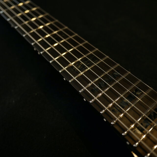 ブラックパールのインレイは、指板調整のままだとあまりにも目立たないので、インレイだけ艶が出るように磨いて仕上げてあります。非常にかっこよく仕上がりましたね。