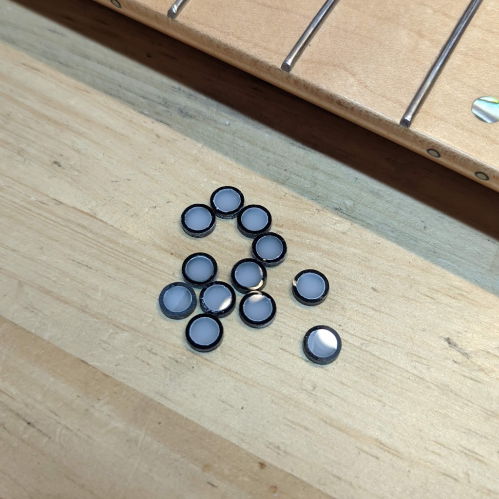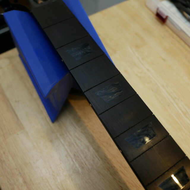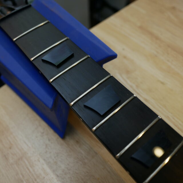 無事彫り終え、接着を指板と面に削ればインレイ加工は完了。