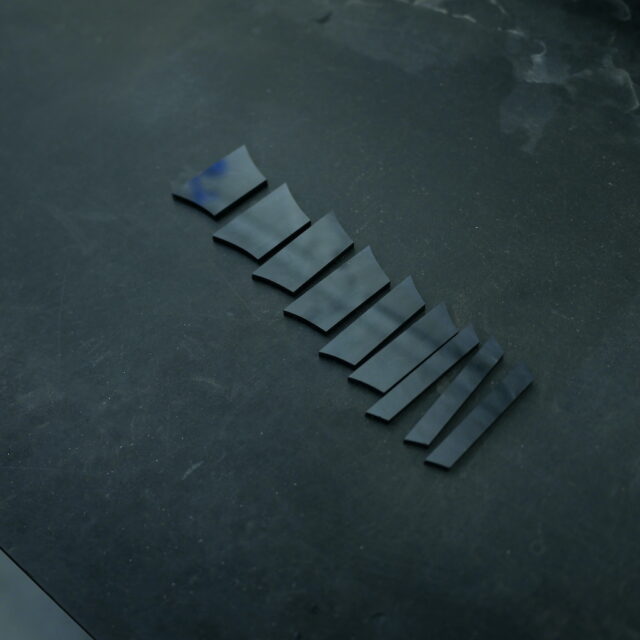 インレイ材に使うのはこだわりの暗めのパール柄。