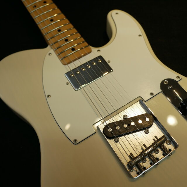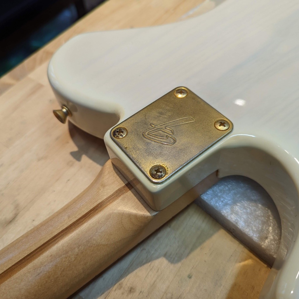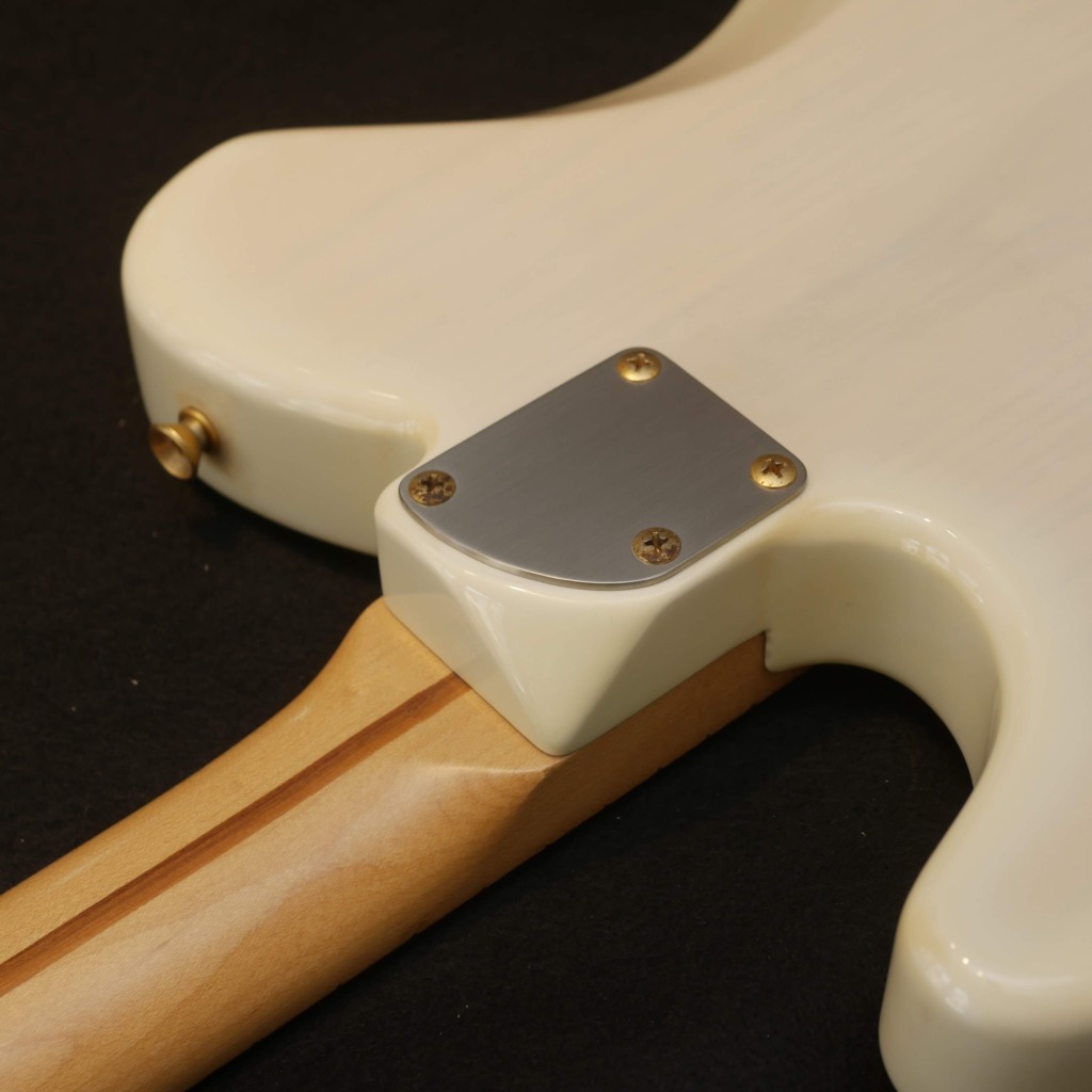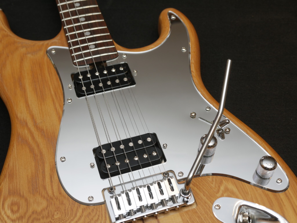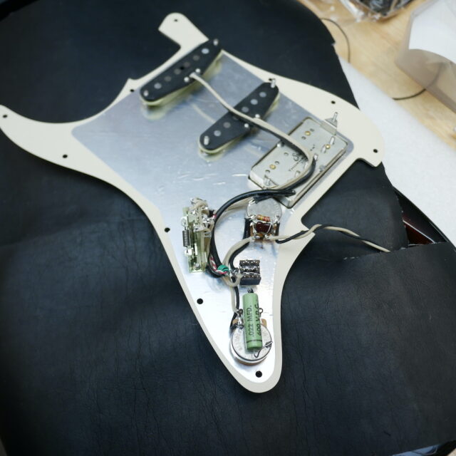 ピックガードはビンテージホワイト3Plyで制作し、S-S-H配列のピックアップ。リアコイルスプリットスイッチ。