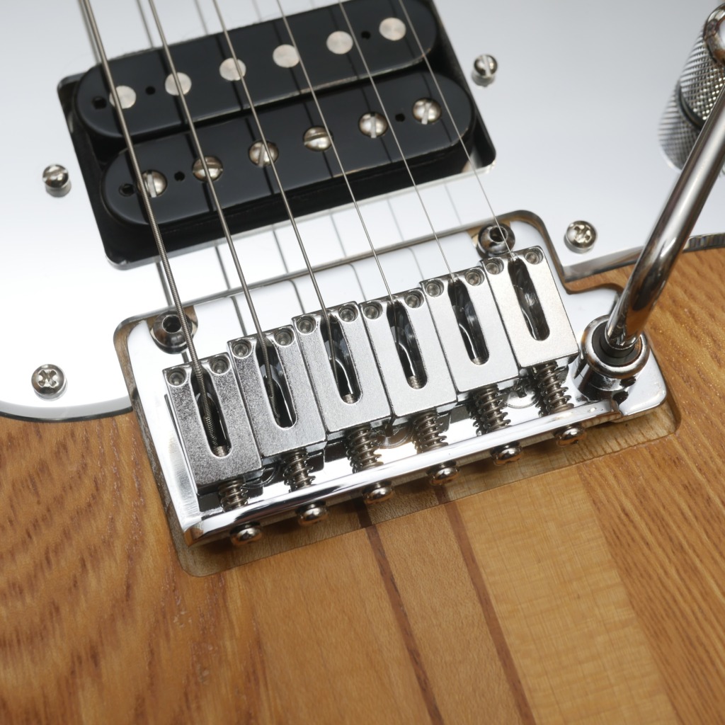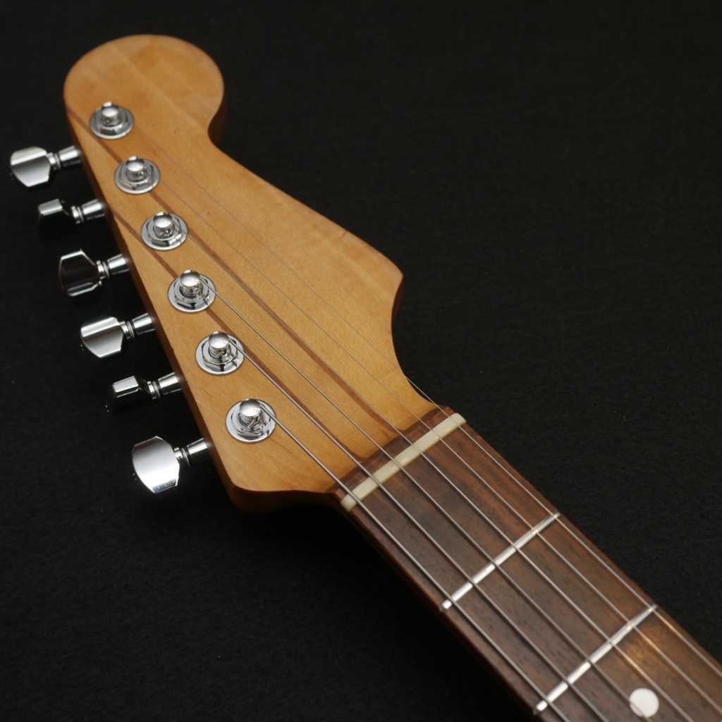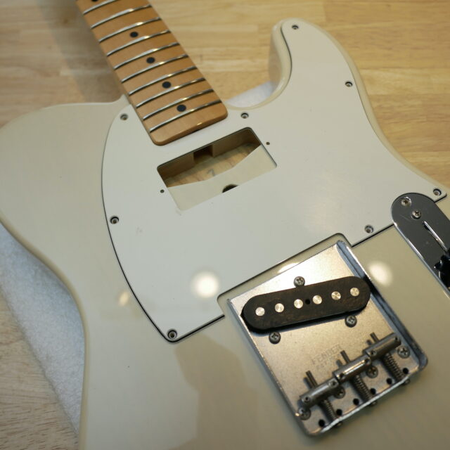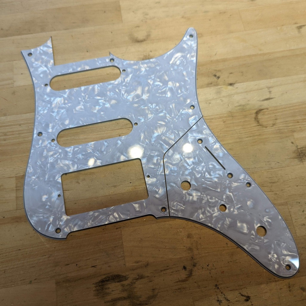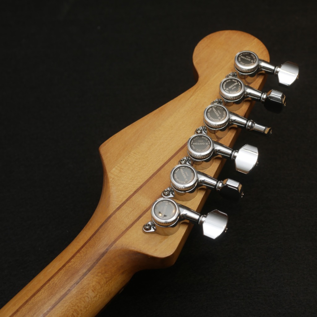ピックガードはビンテージホワイト3Plyで制作し、S-S-H配列のピックアップ。リアコイルスプリットスイッチ。