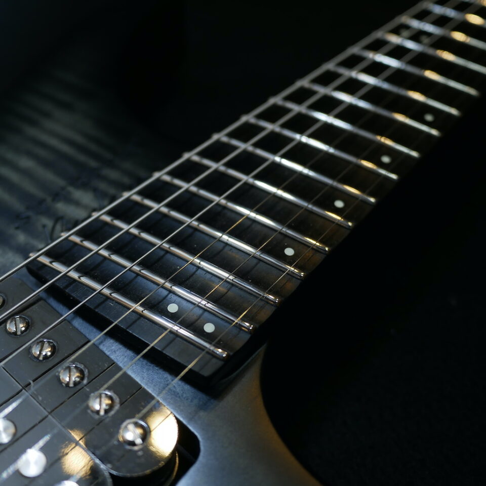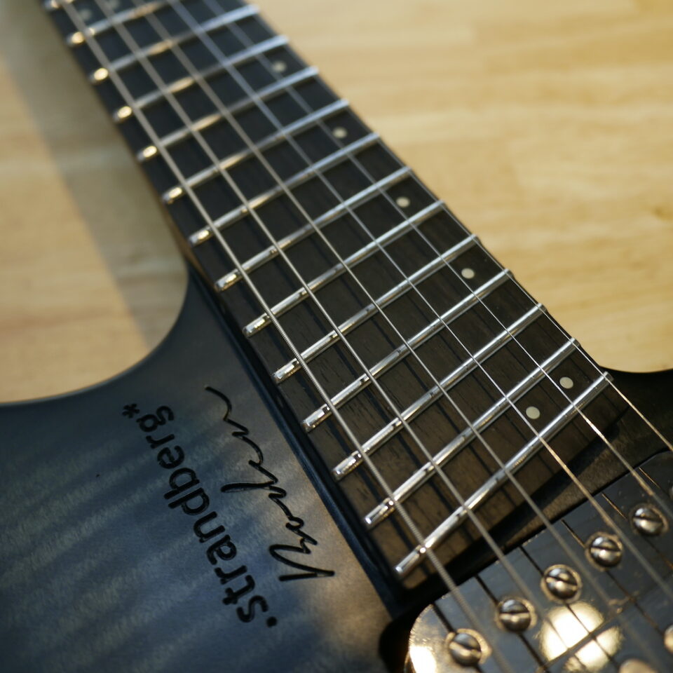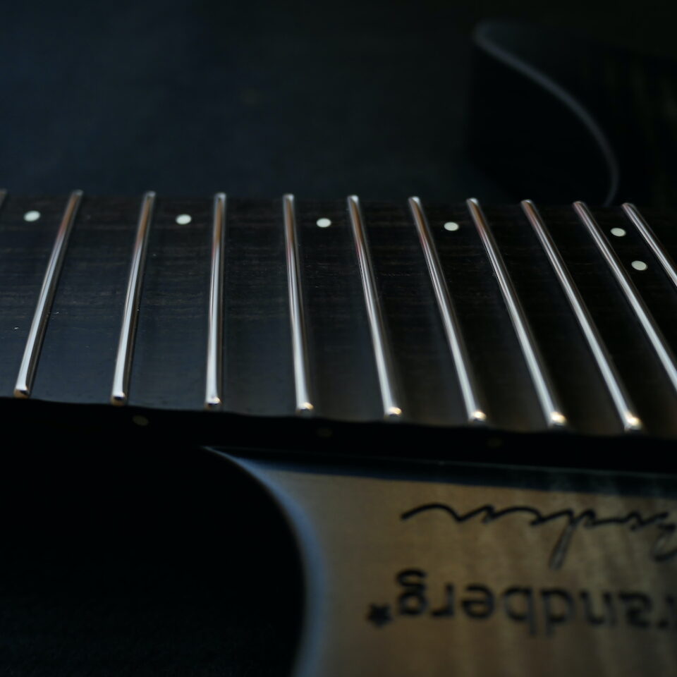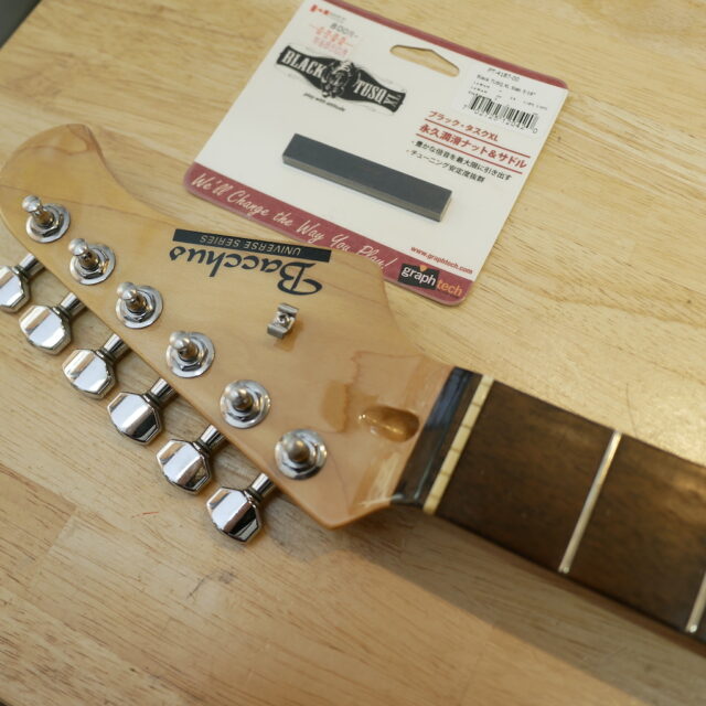 ナットも黒いTUSQ XLで製作。見た目だけでなく、滑りがよくチューニングの安定にも一役買ってくれます。