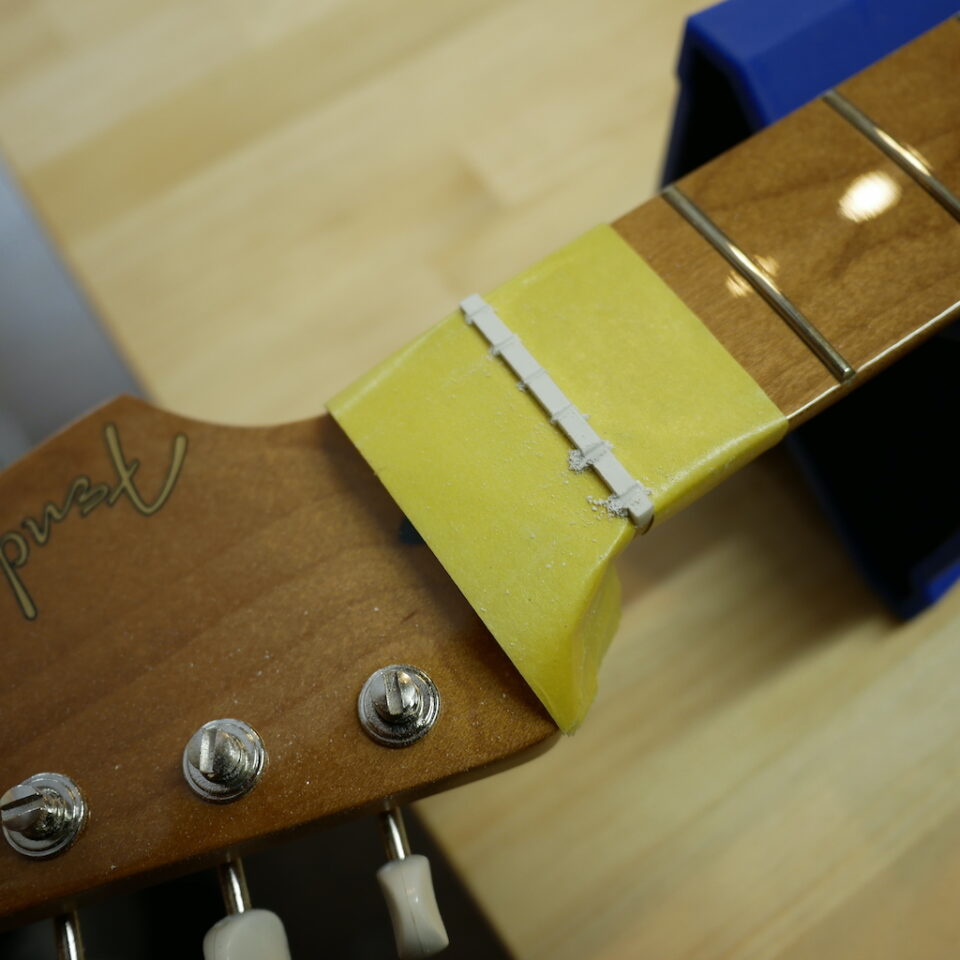 リプレイスメントネックのナットは未加工ため溝を切ります。