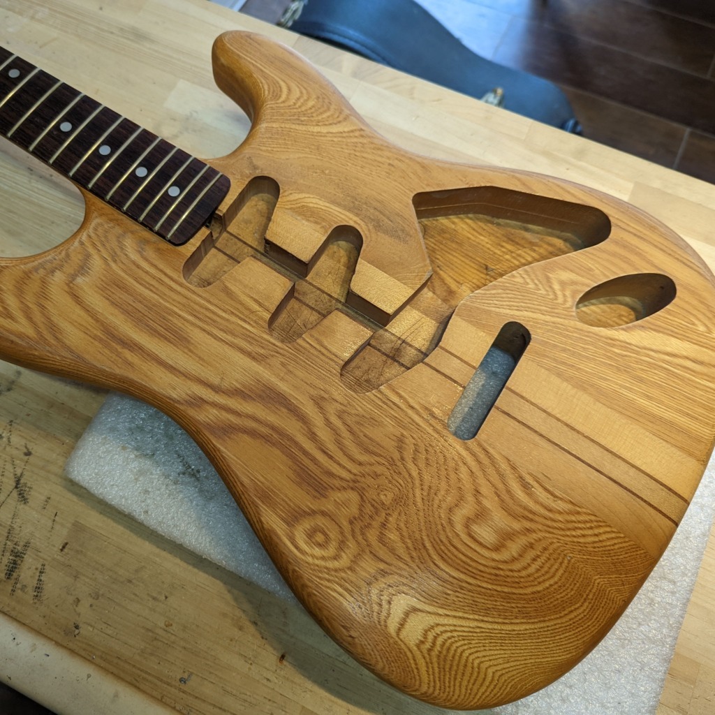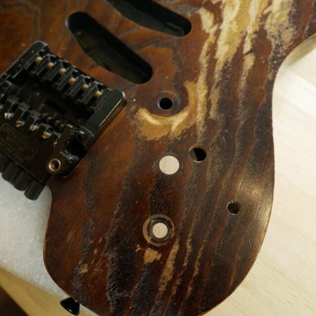 Coolzのボディにネックを取り付け。ピックガードは別のもののようで、ネジ穴を埋めて取り付け。