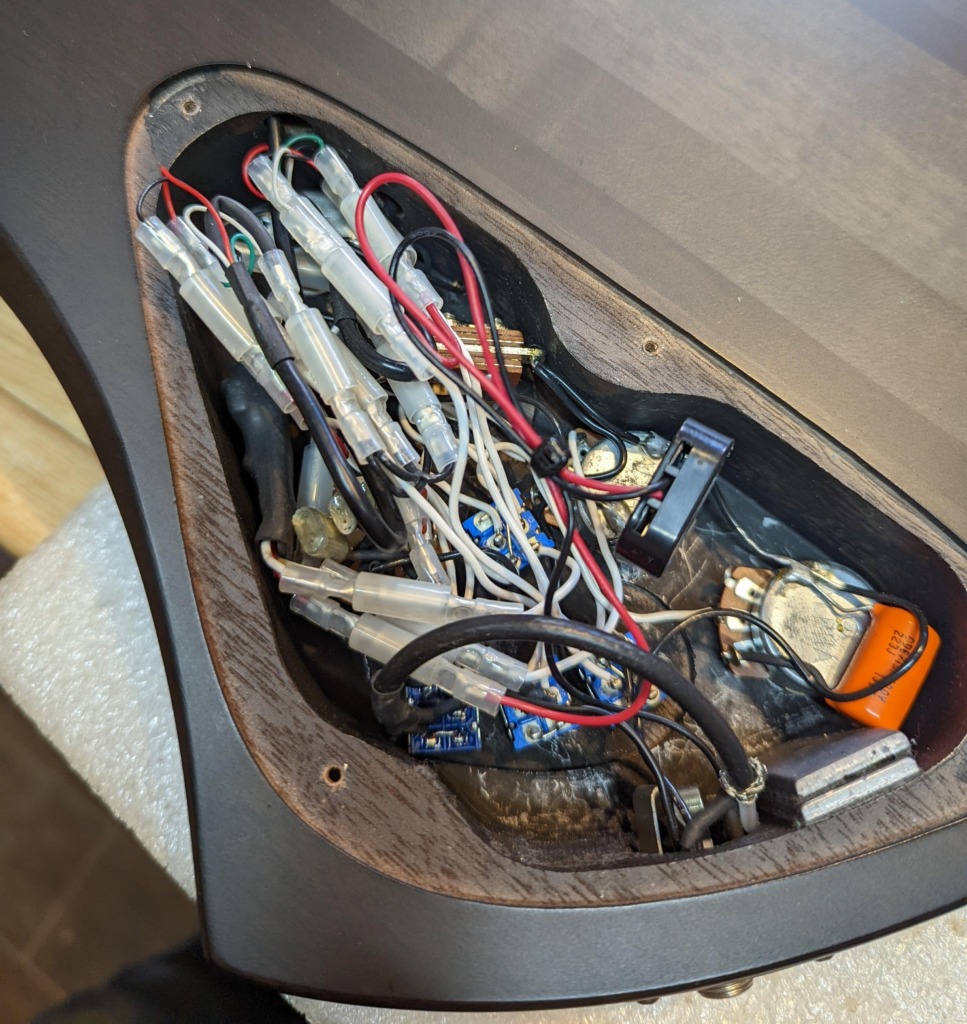 配線はサスティナー作動時のリア強制ハムバッカーモードのために、やたら複雑に。