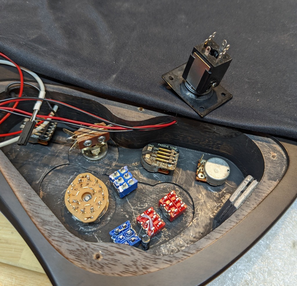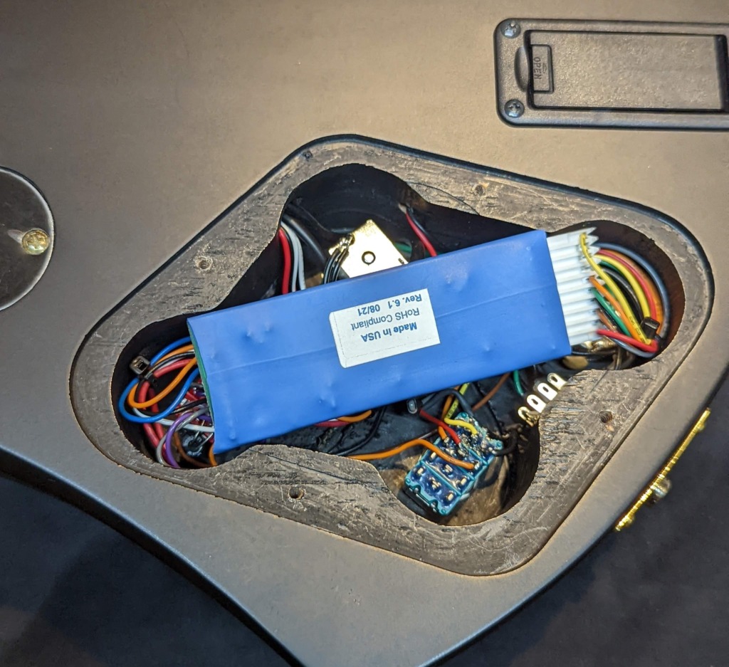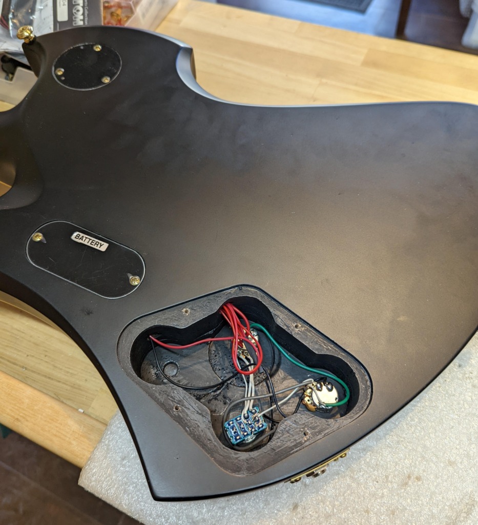 小さい基盤のおかげで、レスポールサイズのコントロールキャビティでも加工なく収まります。
