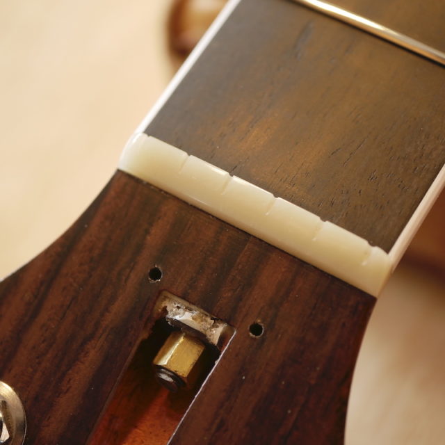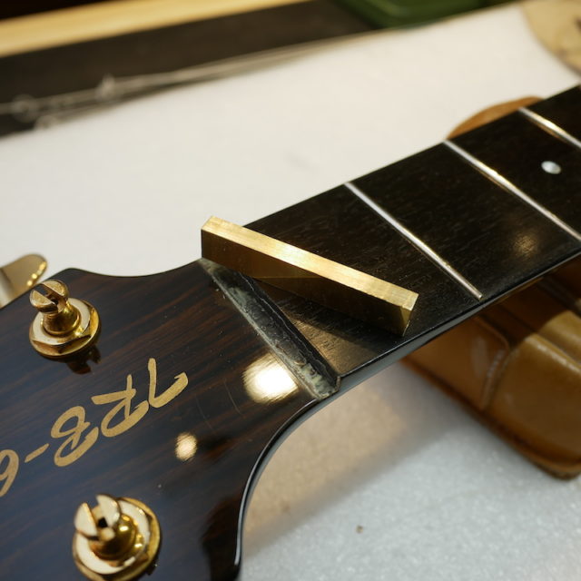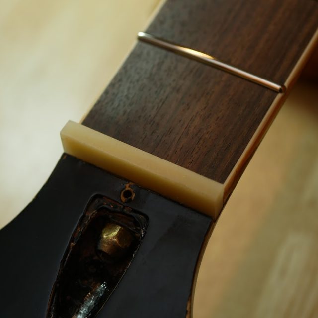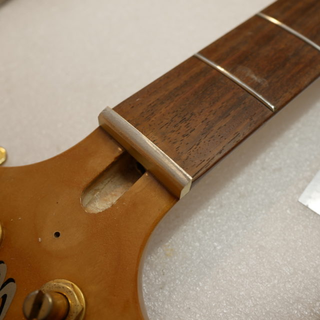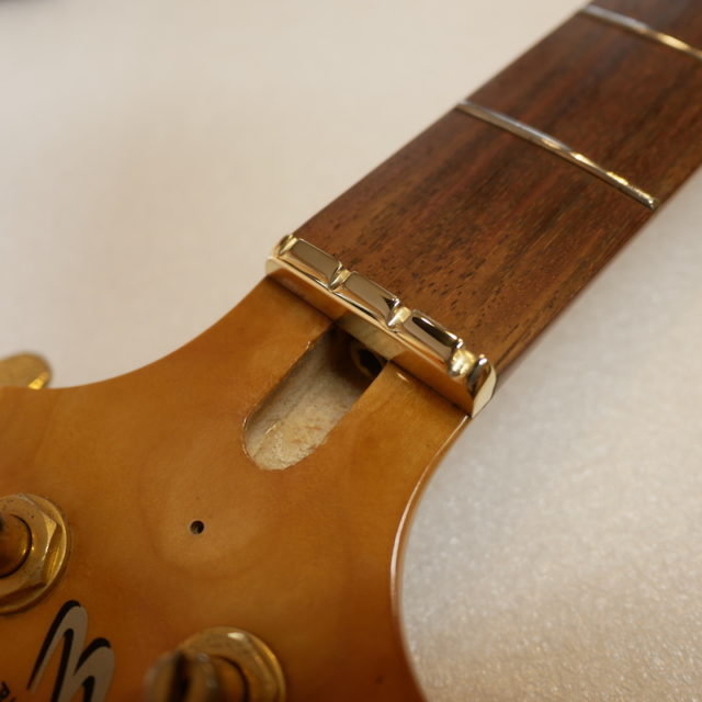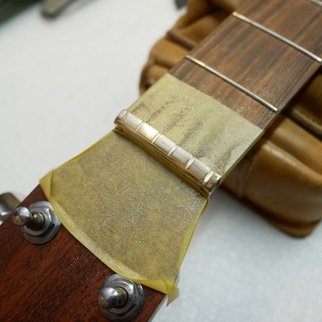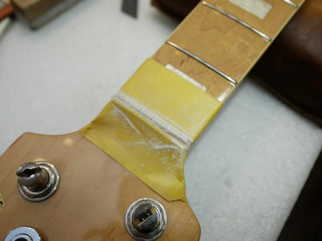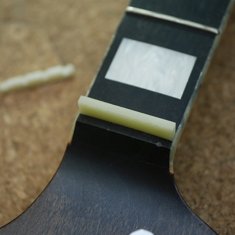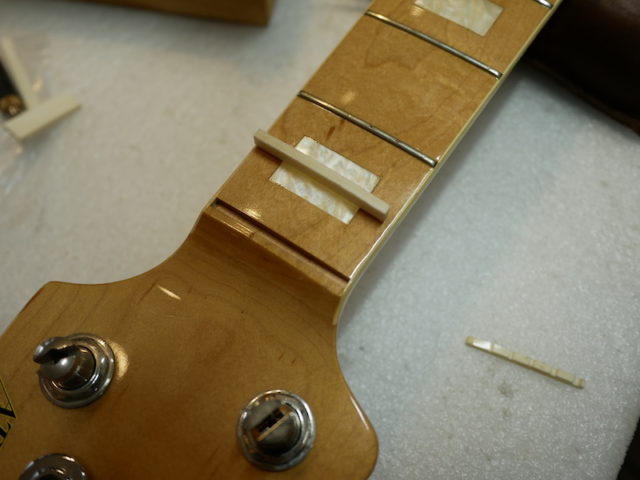 突板をナットスロットに貼ってから、1弦側にナットスロットを広げて底面を平らに加工。