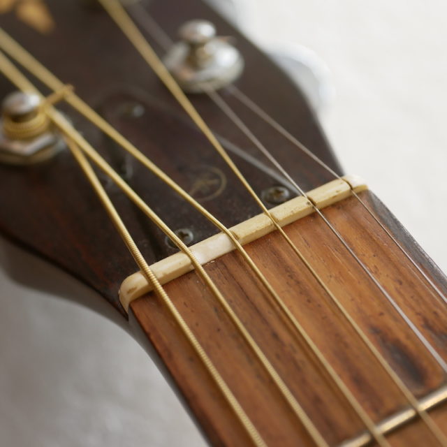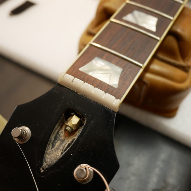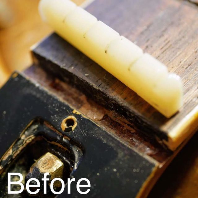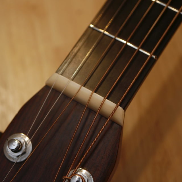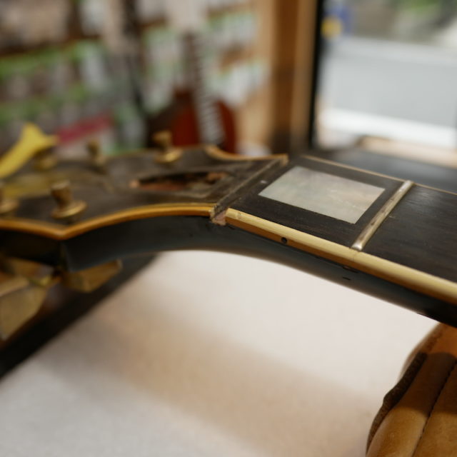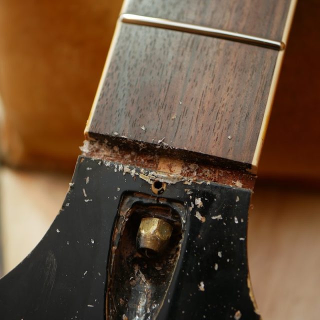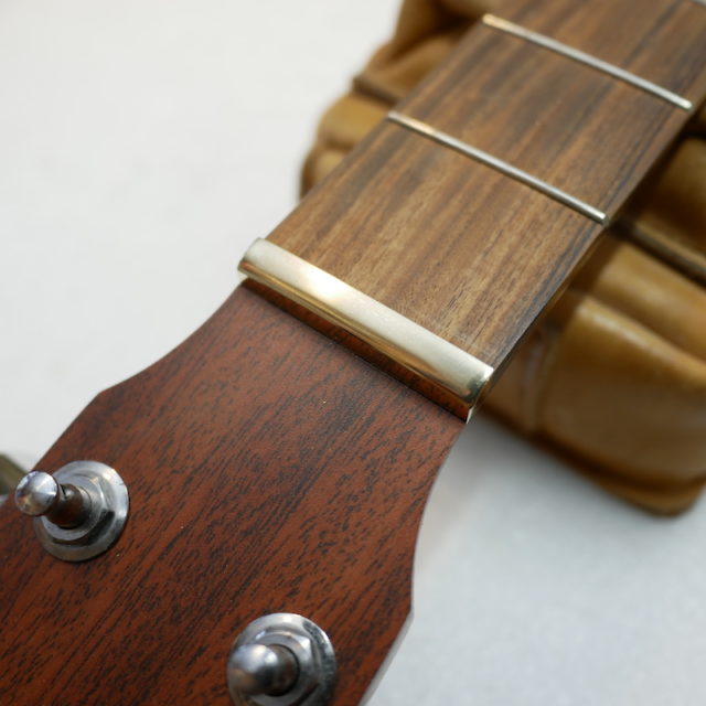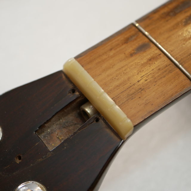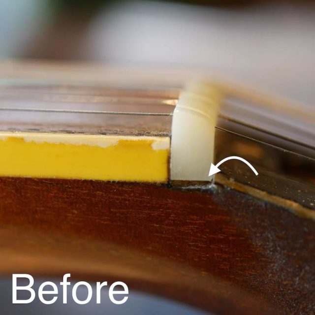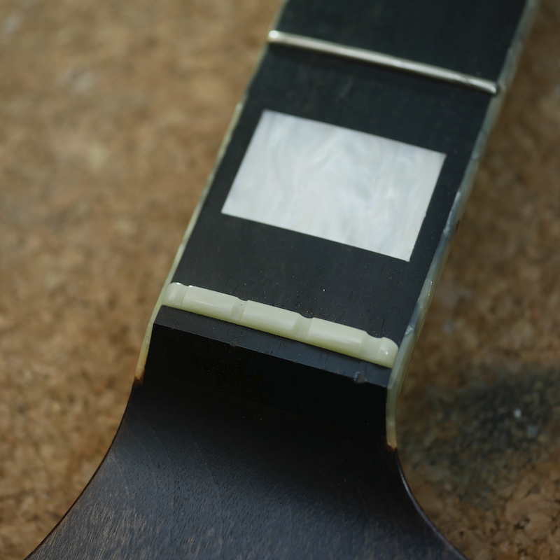 突板をナットスロットに貼ってから、1弦側にナットスロットを広げて底面を平らに加工。
