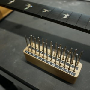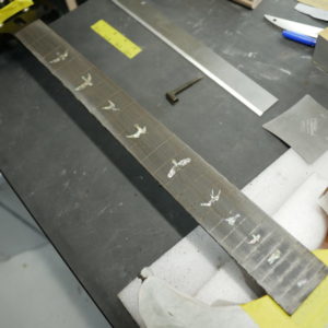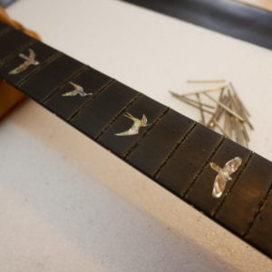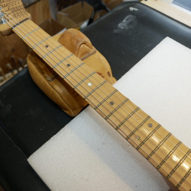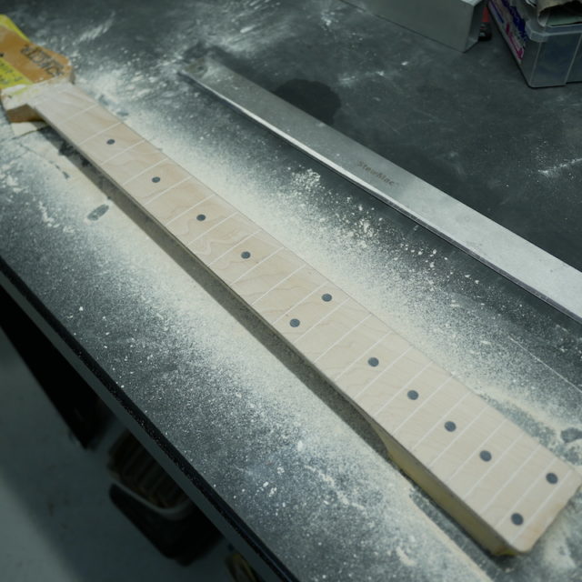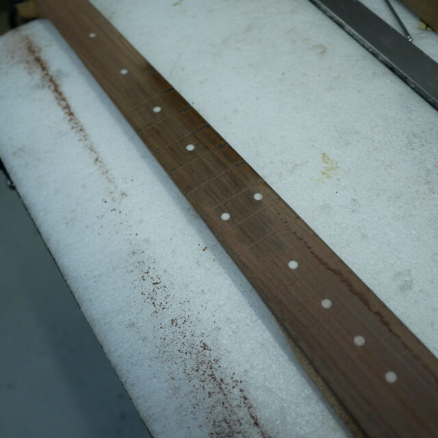 フレットを抜き、トップサイドのポジションマークをすべて取り外しました。