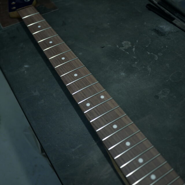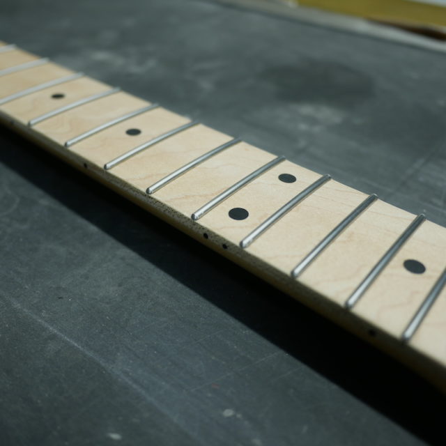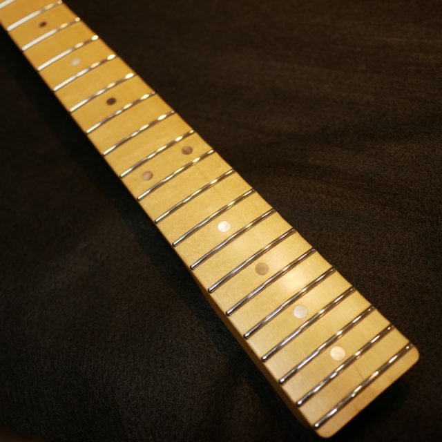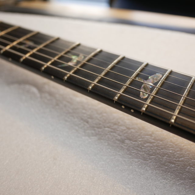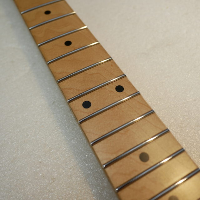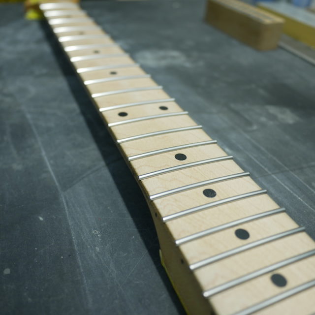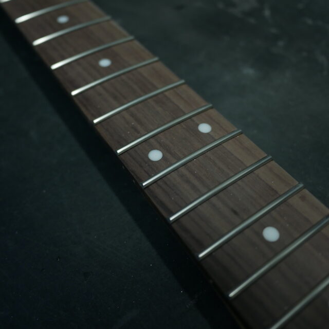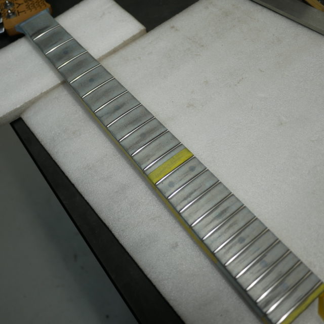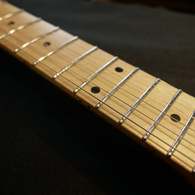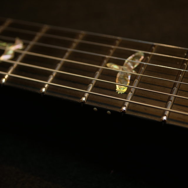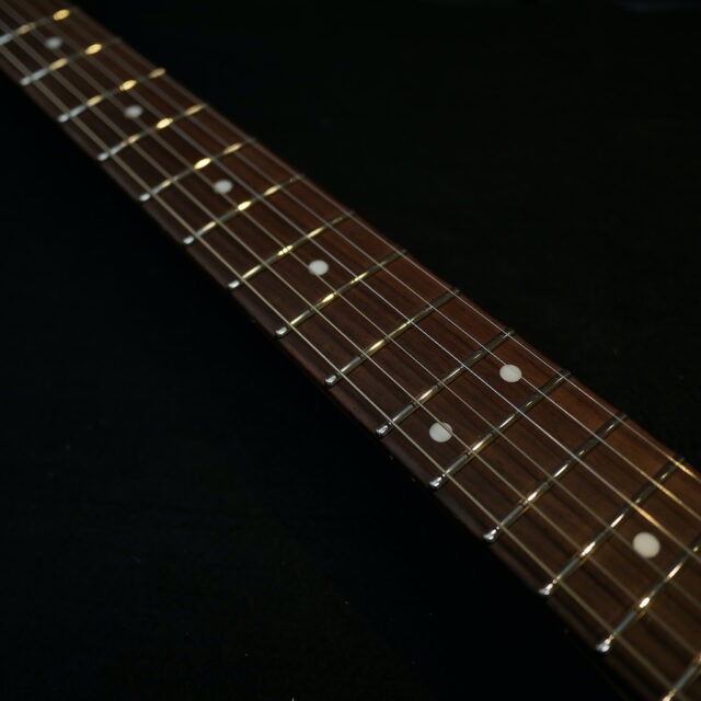 フレットは Jescar 58118S ジャンボサイズのステンレスフレットを打ち込み。耐久性・プレイアビリティともに最高の仕様です。