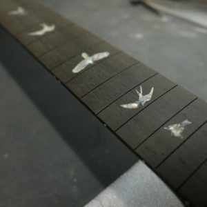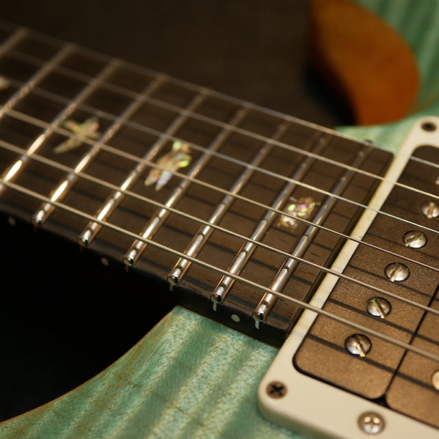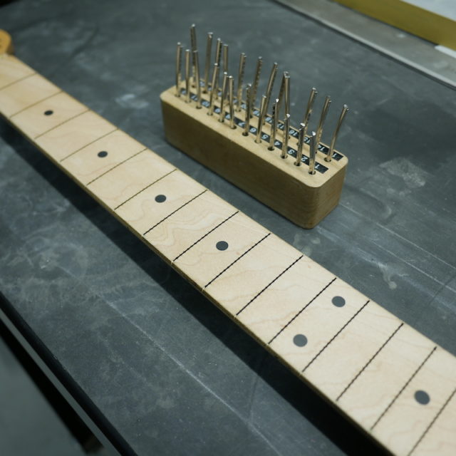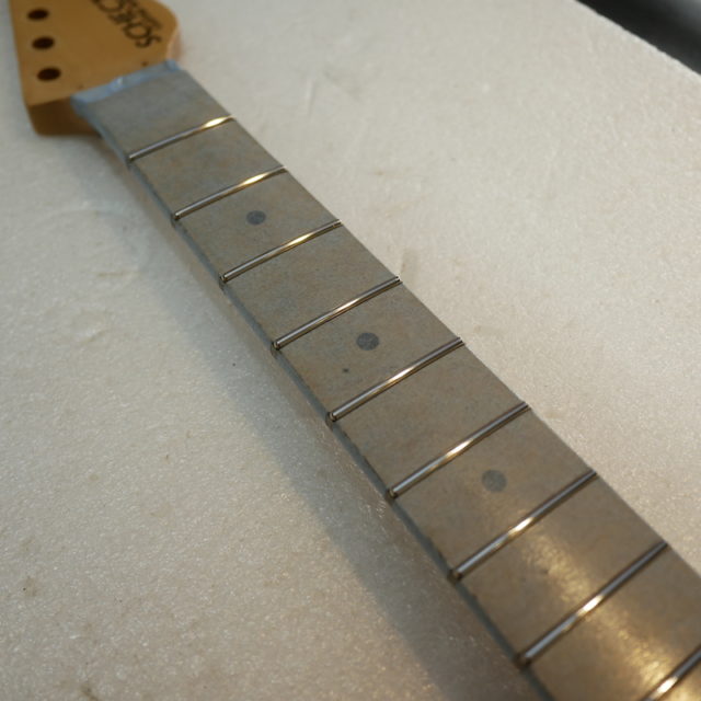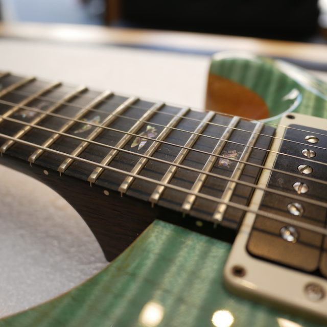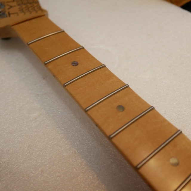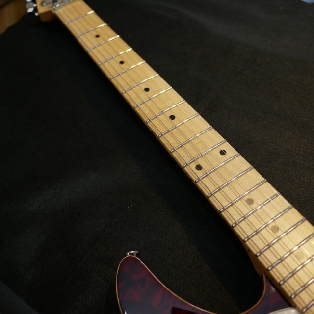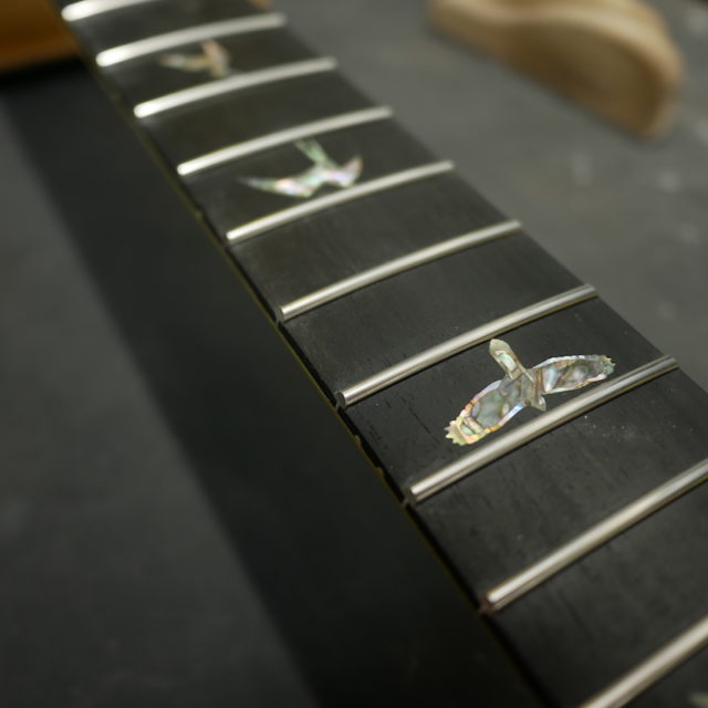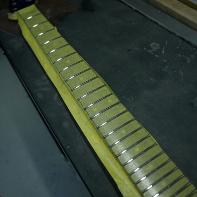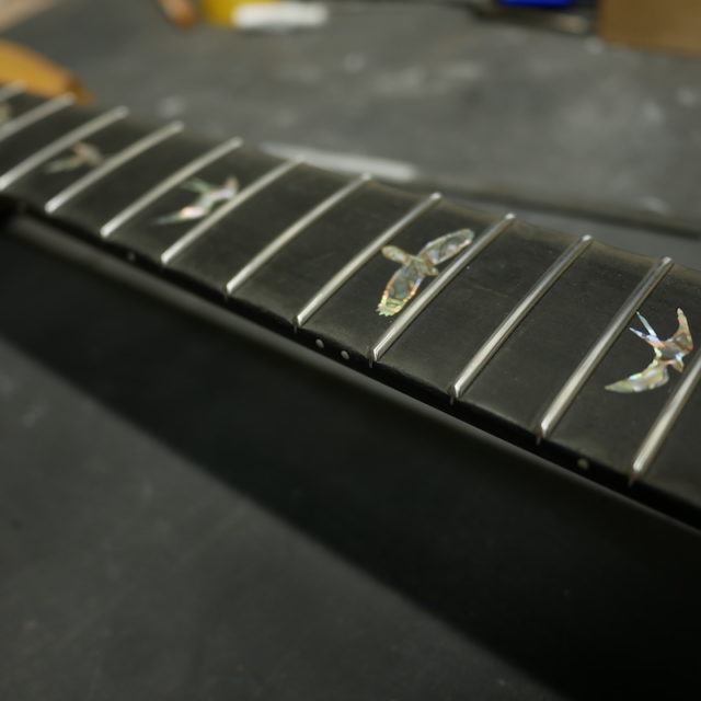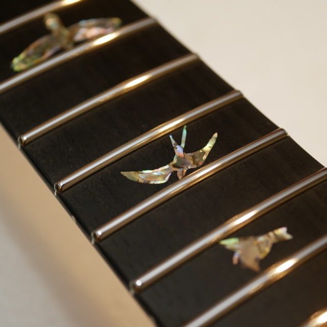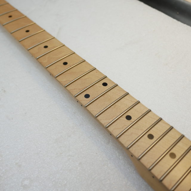 フレットは Jescar 58118S ジャンボサイズのステンレスフレットを打ち込み。耐久性・プレイアビリティともに最高の仕様です。