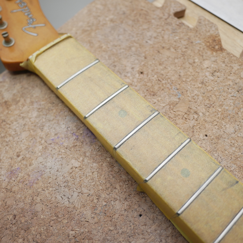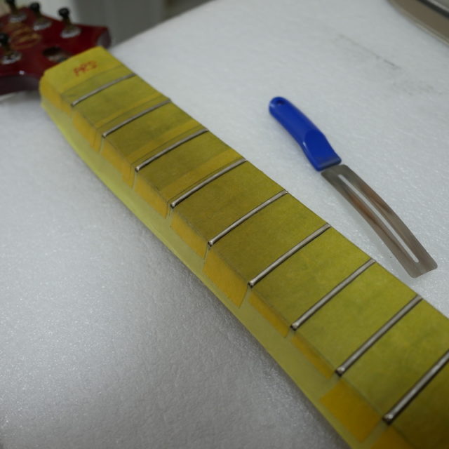 フレット部分に浮きや凹みがあり、まずはそこを直していきます。