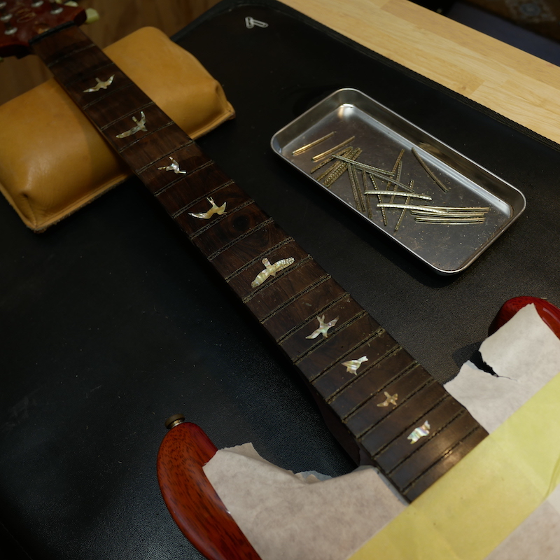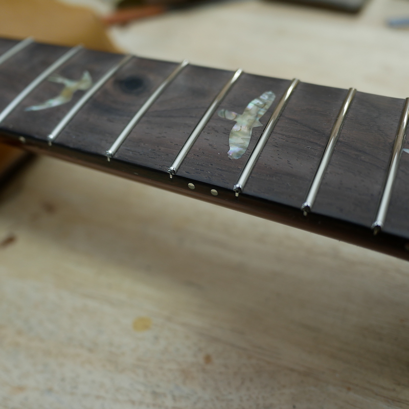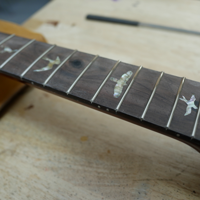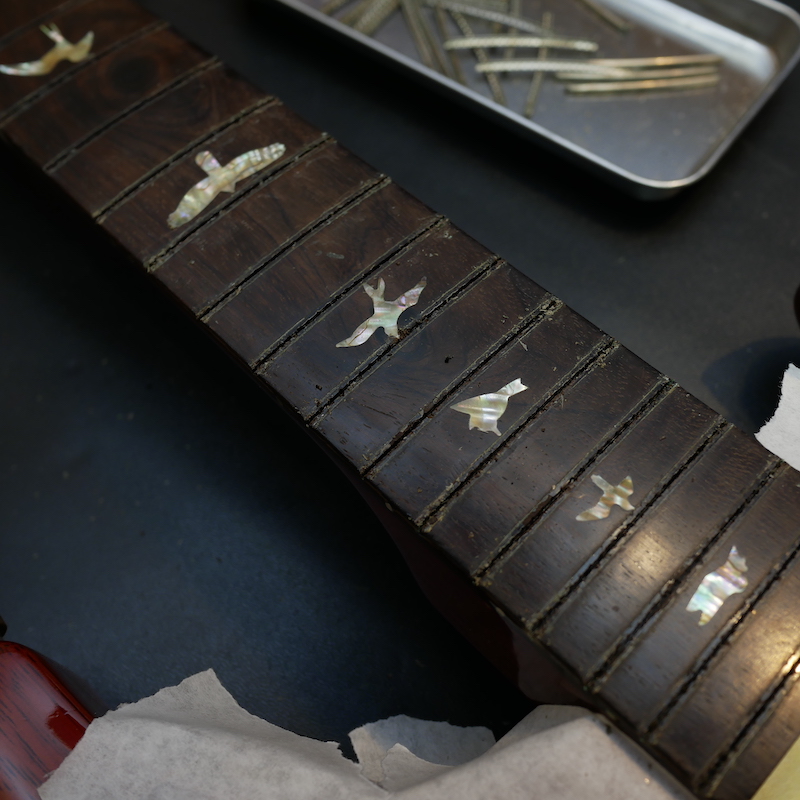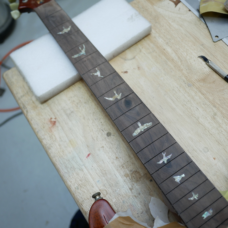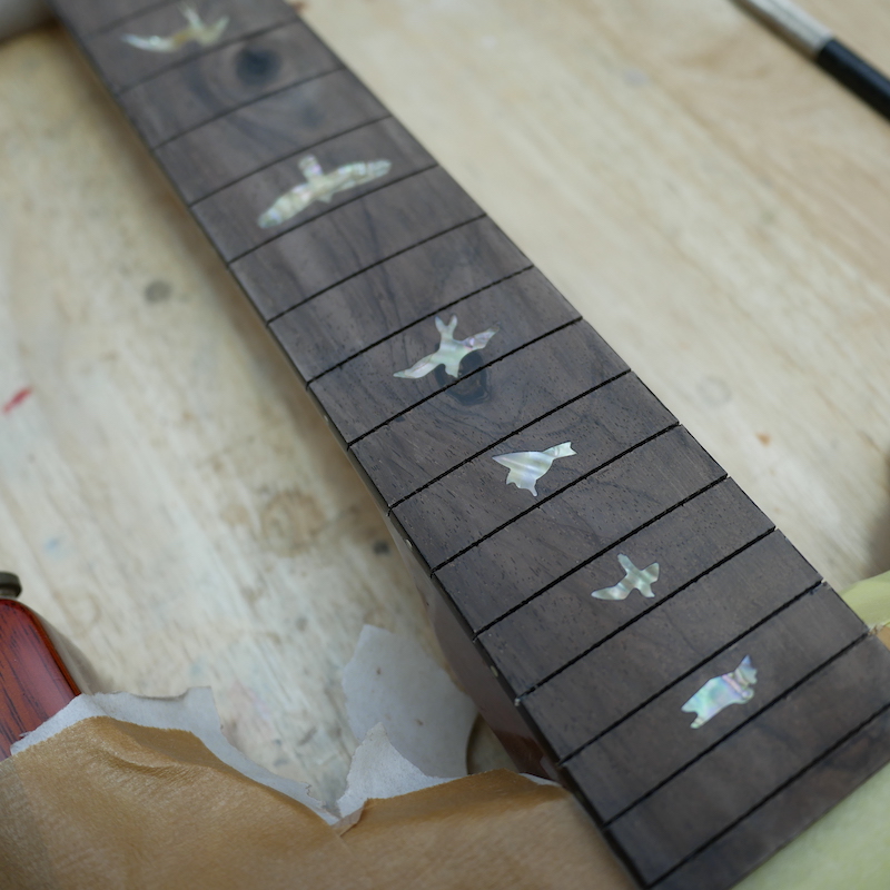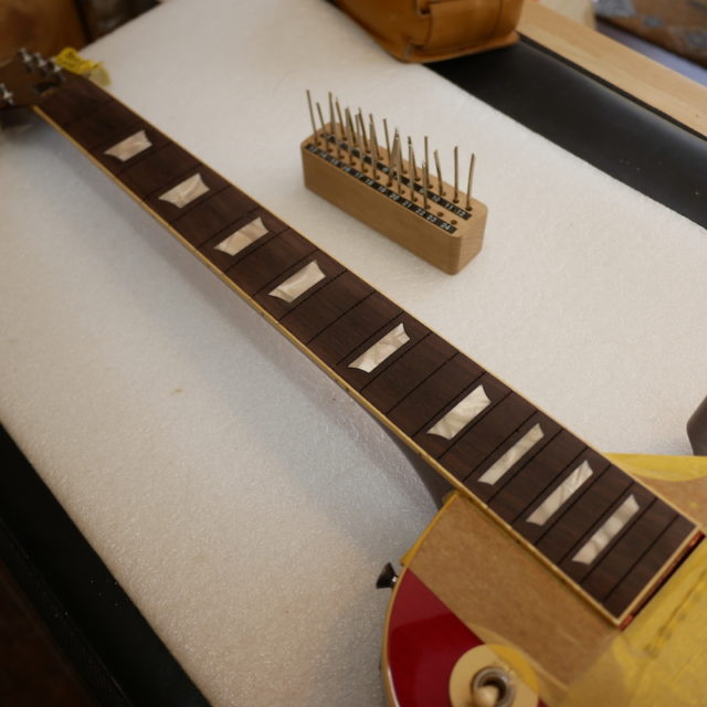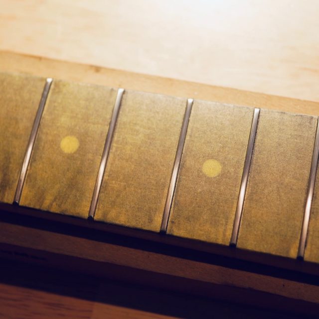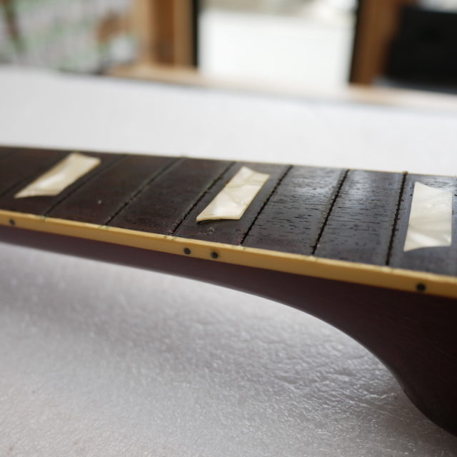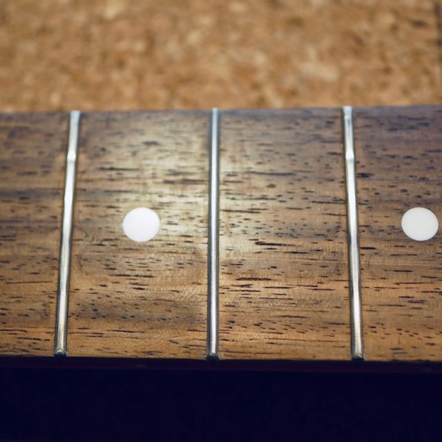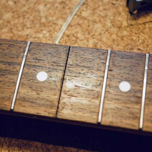 フレットを打ち込んだら、ドットポジションマークをドリルで彫り込んで埋め込み。