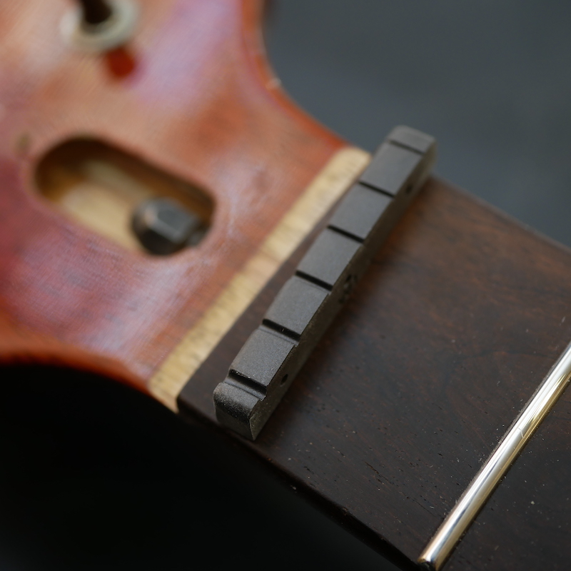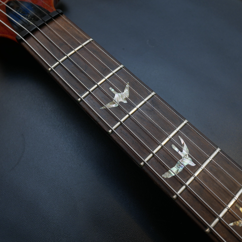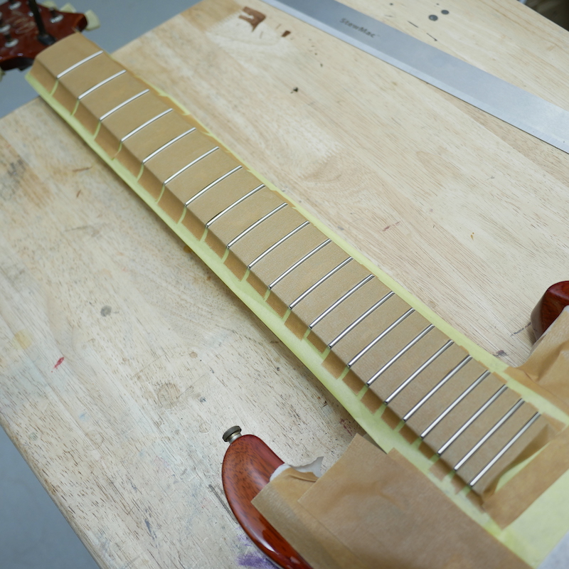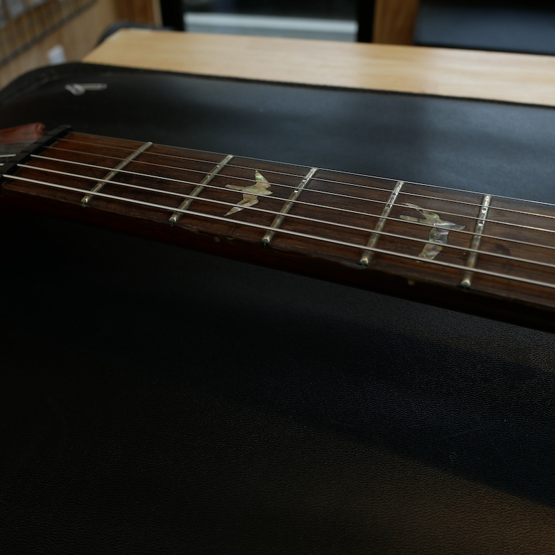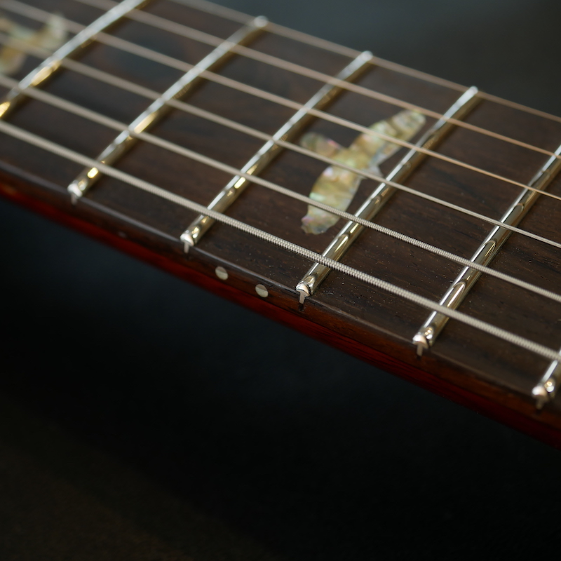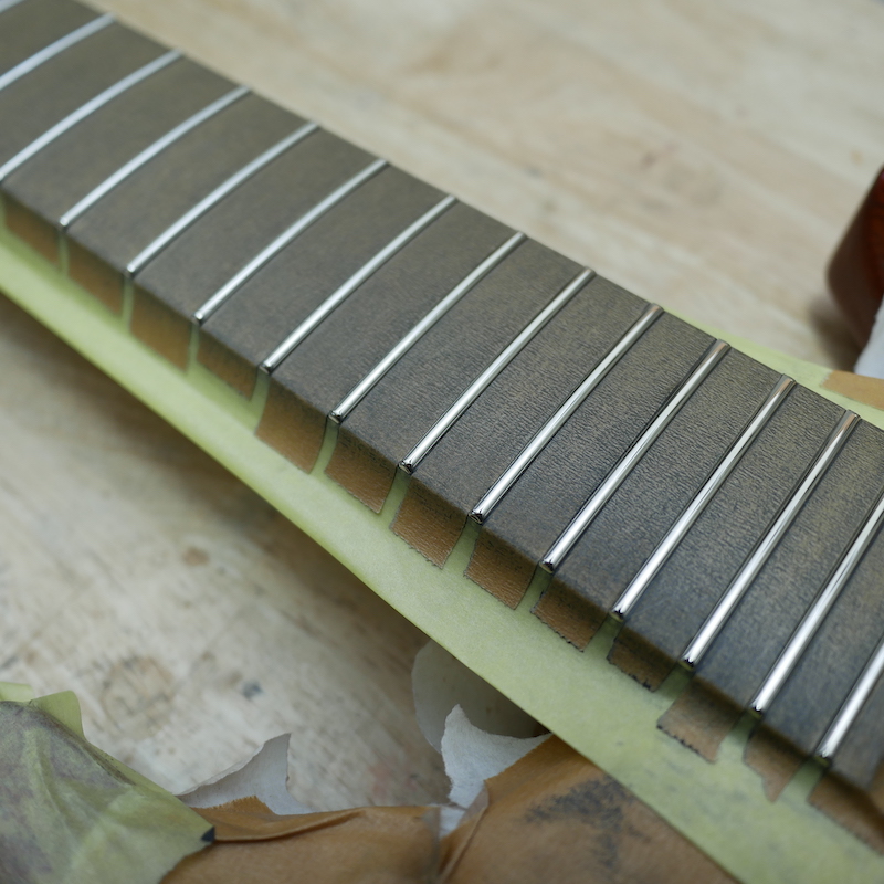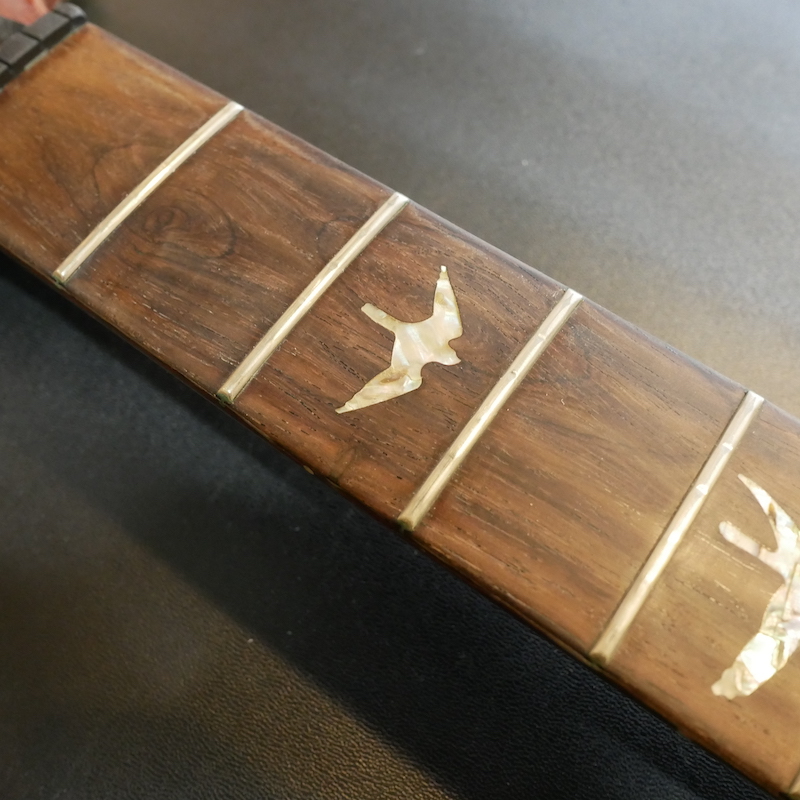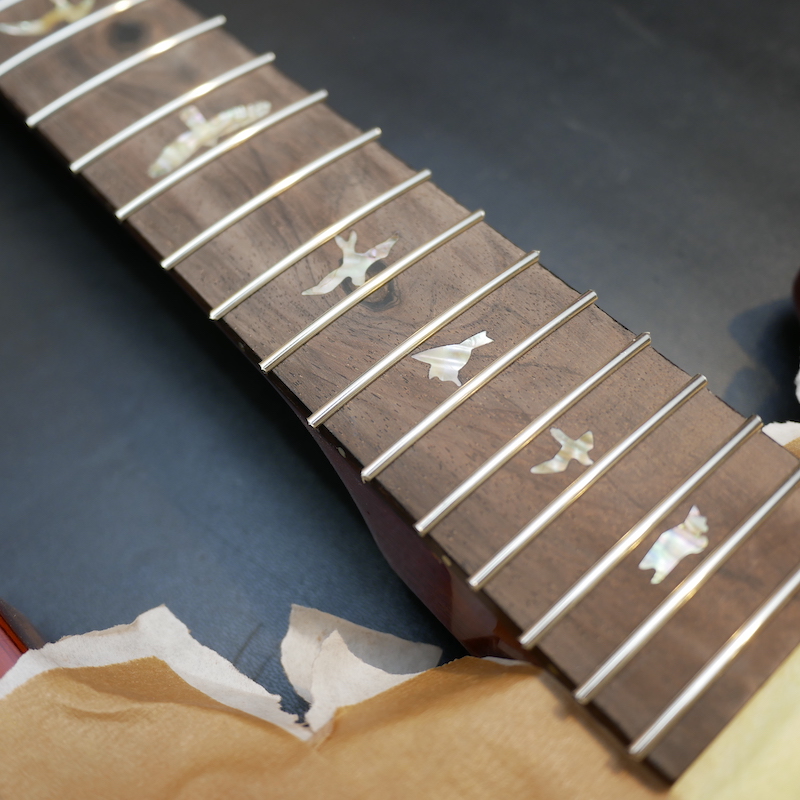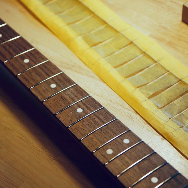 フレットを打ち込んだら、ドットポジションマークをドリルで彫り込んで埋め込み。