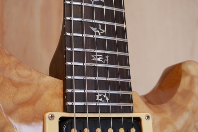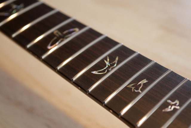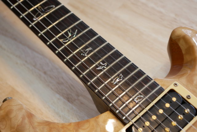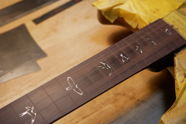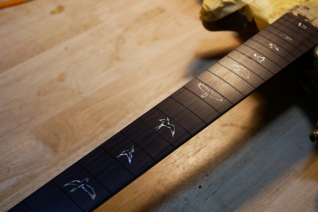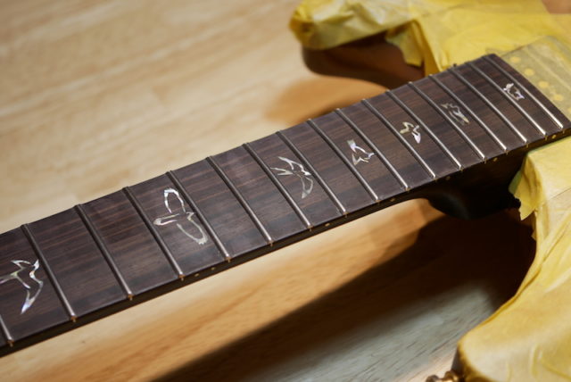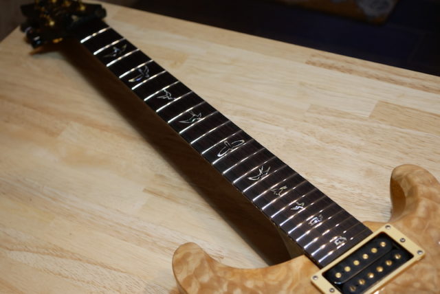 何本かフレット交換が重なっていたためか、写真がありませんがフレットを打ち終わりフレットサイドを処理します。今回はPRSの元の状態に近いように加工します。