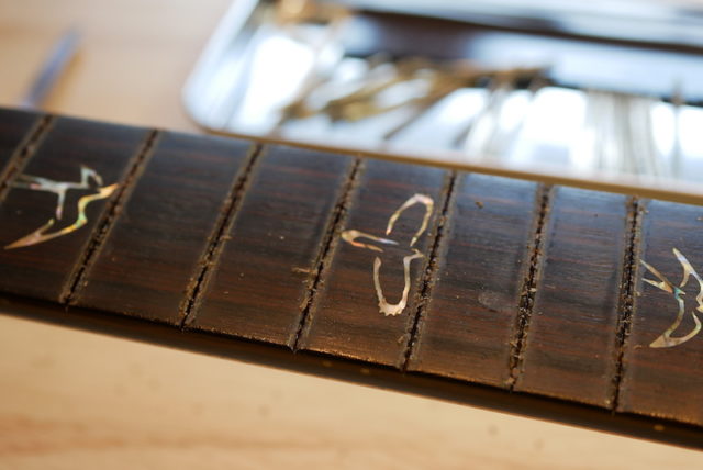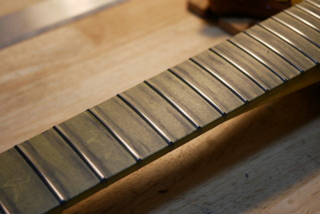指板調整。ネックの状態は非常に良かったですが、多少修正は必要なようです。15フレット付近は少し凹んでます。